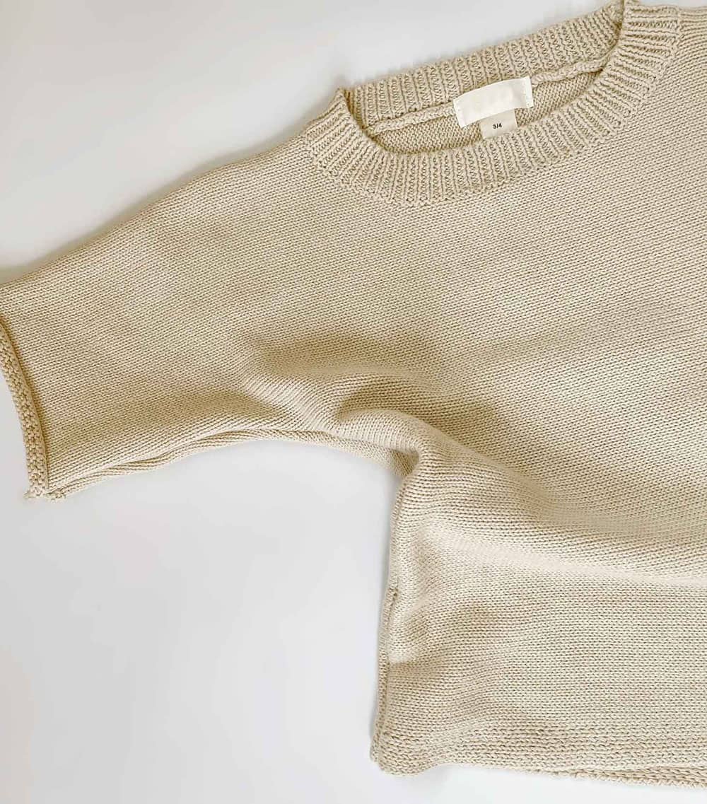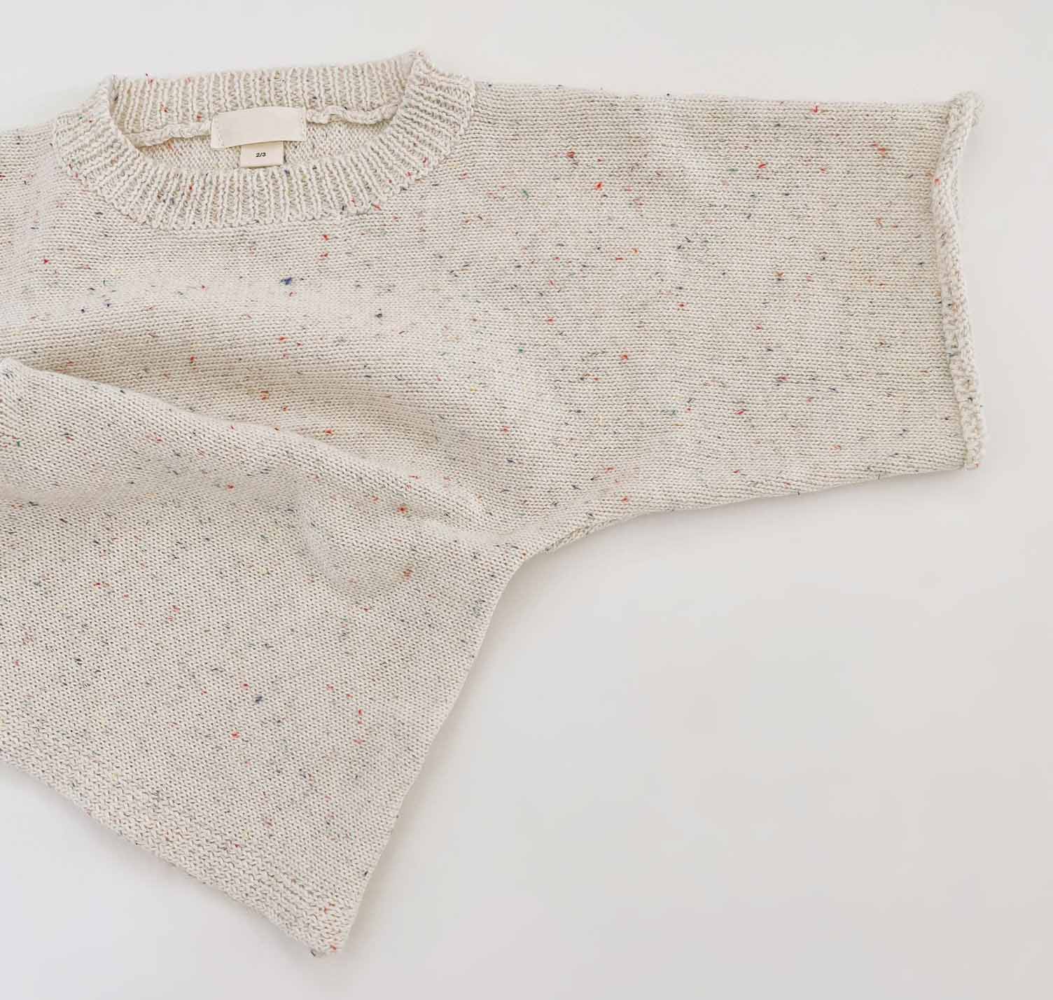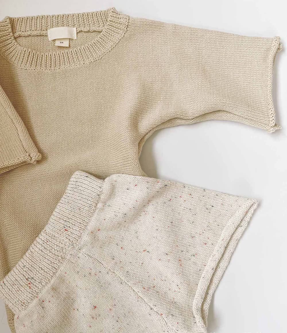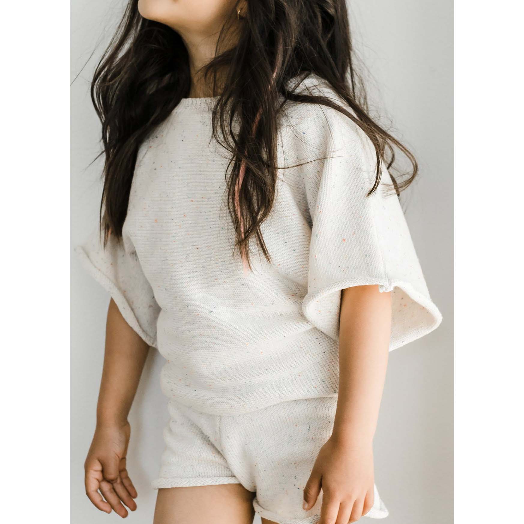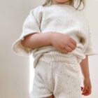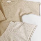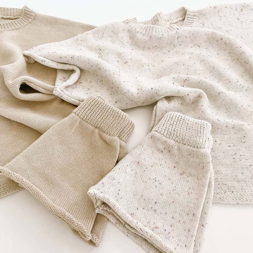 This baby kids cotton knit set offers a clean, comfortable, and practical option for everyday wear. The set includes a short sleeve knit pullover and matching knit shorts. Both pieces use soft speckled cotton, also known as nep cotton, which adds subtle texture without overwhelming the design. As a result, the minimalist look suits modern baby wardrobes and seasonal collections.