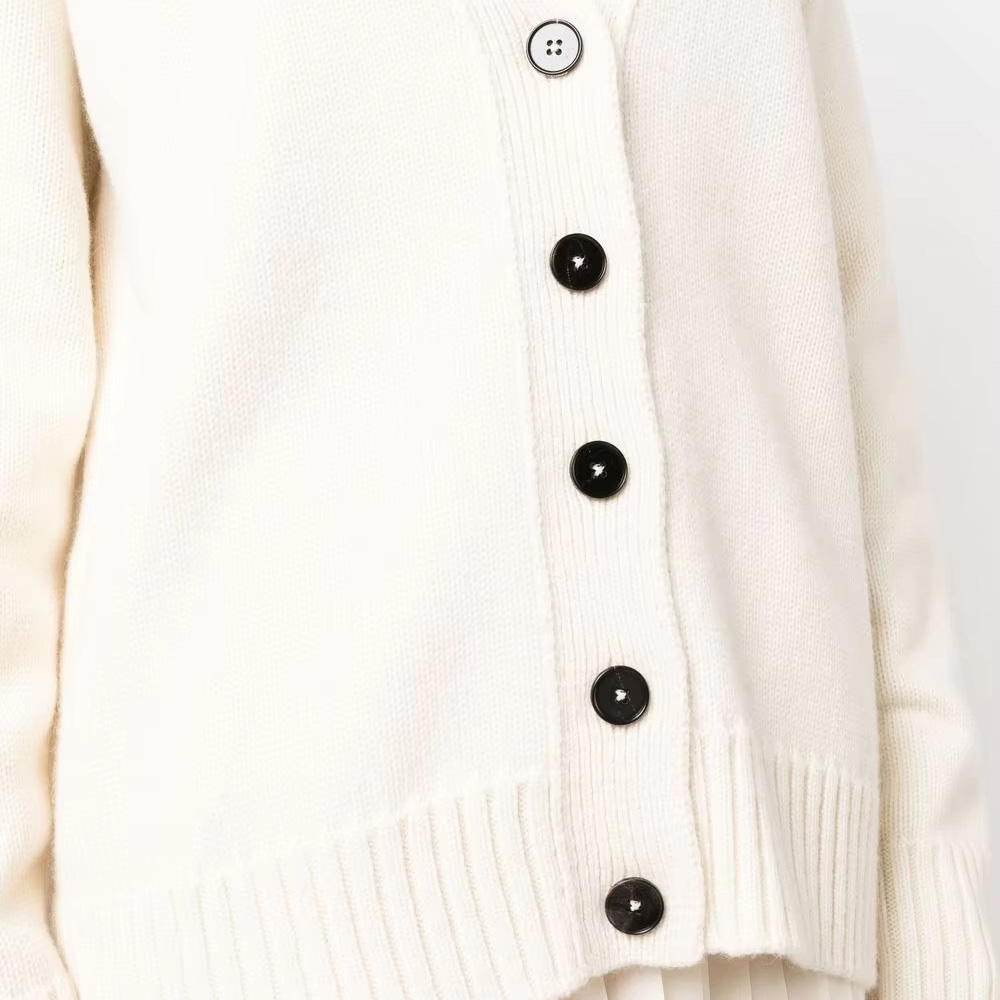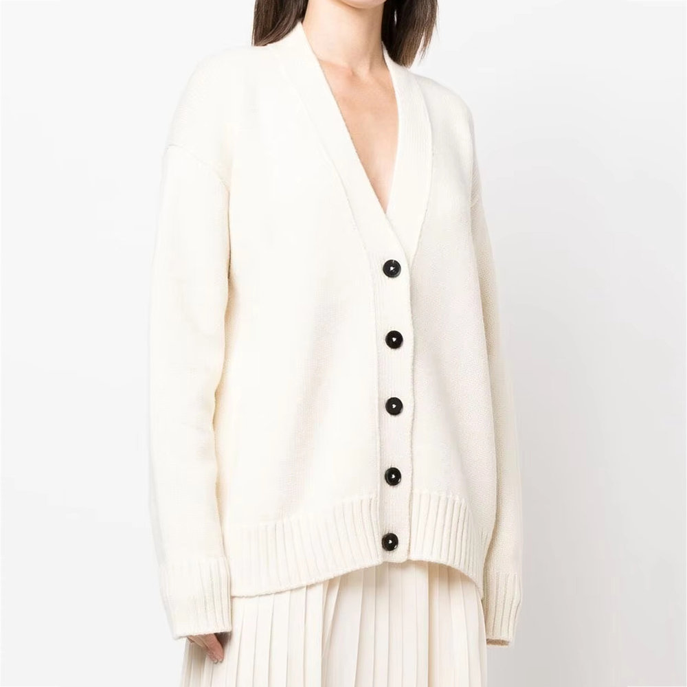Featuring a clean white tone, deep V-neckline, and front button closure, this women’s wool cardigan blends modern simplicity with timeless knitwear elements. Ribbed trims along the neckline, cuffs, and hem add subtle texture while enhancing durability and shape retention.