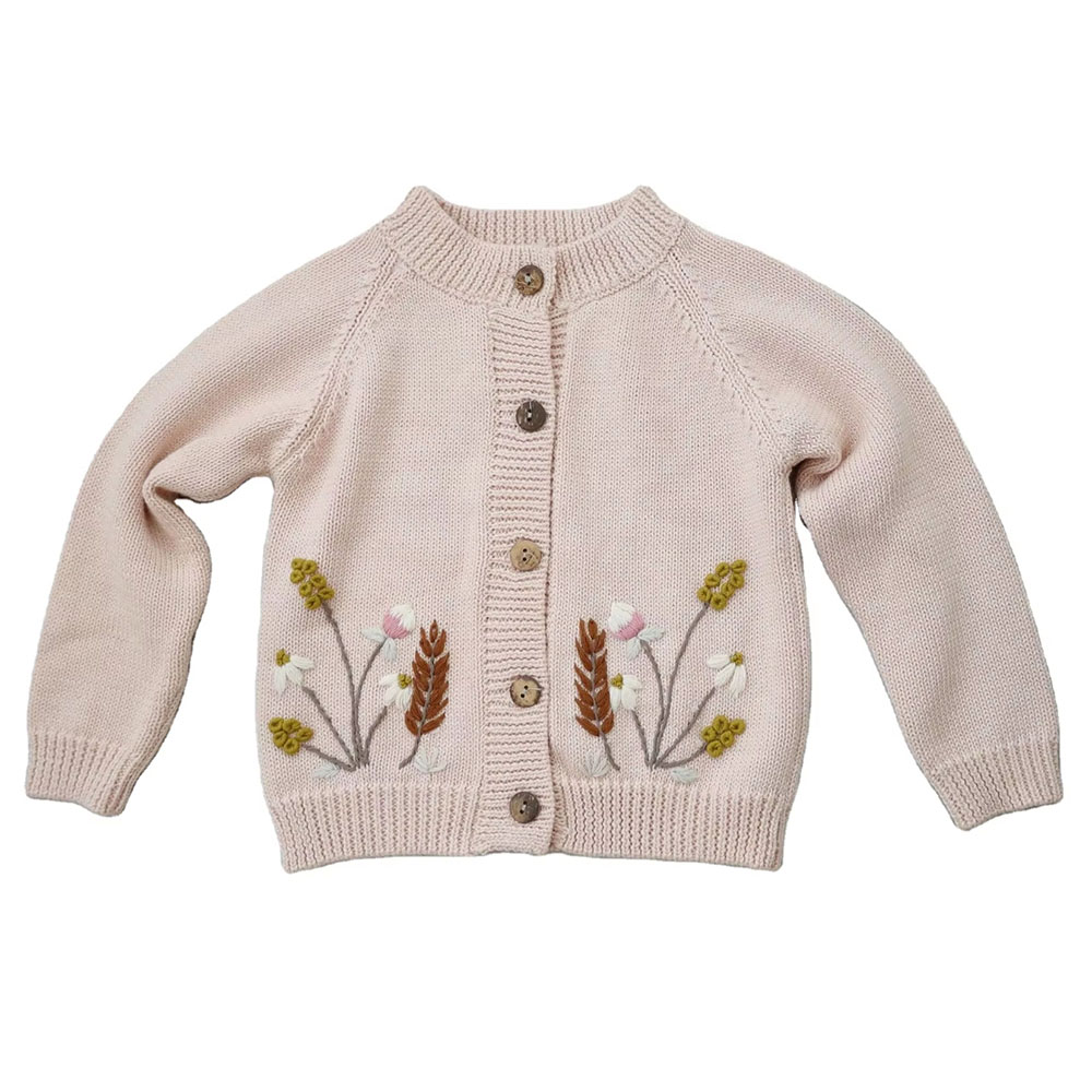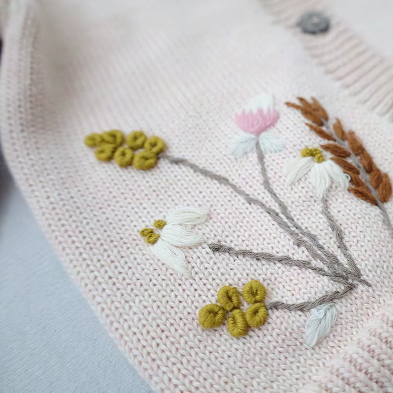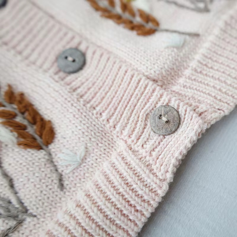 This baby girl embroidery cardigan sweater brings a soft and cozy feel with its breathable cotton knit, giving newborns gentle comfort during colder days. The design highlights handmade embroidery floral details that add a sweet, delicate touch to this knitwear piece.