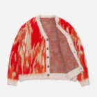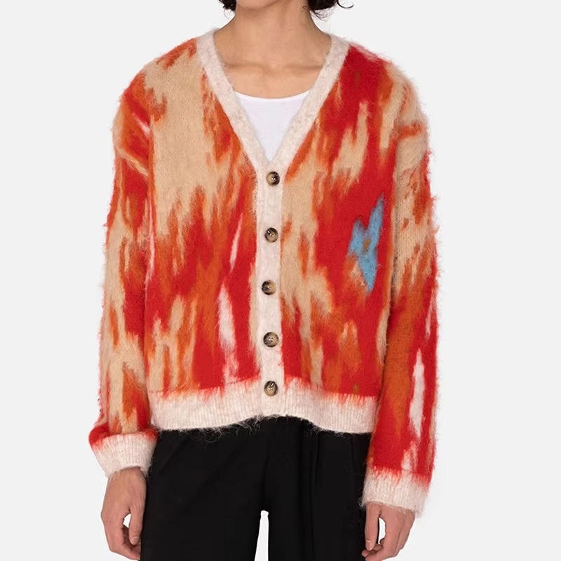 What sets this wool knit cardigan sweater apart is its fuzzy surface and abstract jacquard pattern. The tactile wool fibers create a soft, cozy feel, while the textured pattern adds depth and dimension to your outfit. The clean V-neckline and button front closure give it a classic cardigan style with a refined edge. It transitions effortlessly from street style to semi-formal wear, making it an ideal layering piece for modern wardrobes.