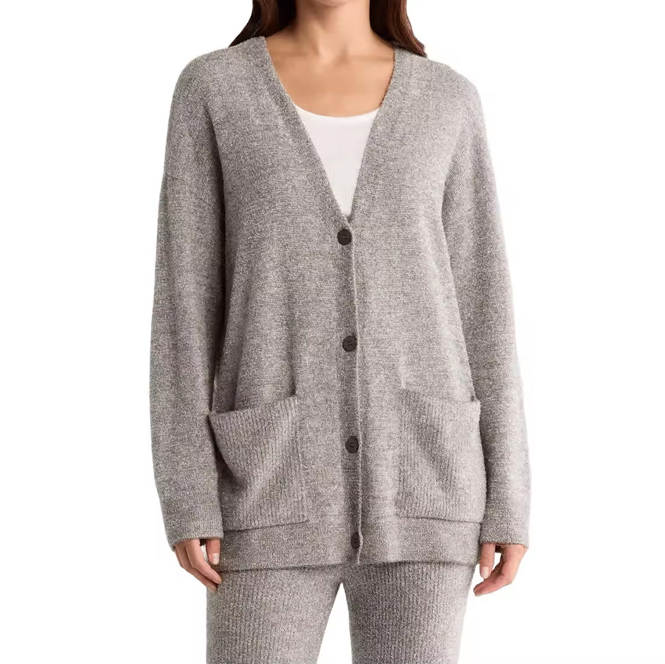 This women’s gray V-neck cardigan sweater delivers soft comfort, light warmth, and a relaxed everyday look in a clean, minimalist tone. Its smooth nylon knit creates a gentle, breathable texture that feels comfortable for long wear, while the long sleeves and button-down front make layering simple across cool and transitional seasons.