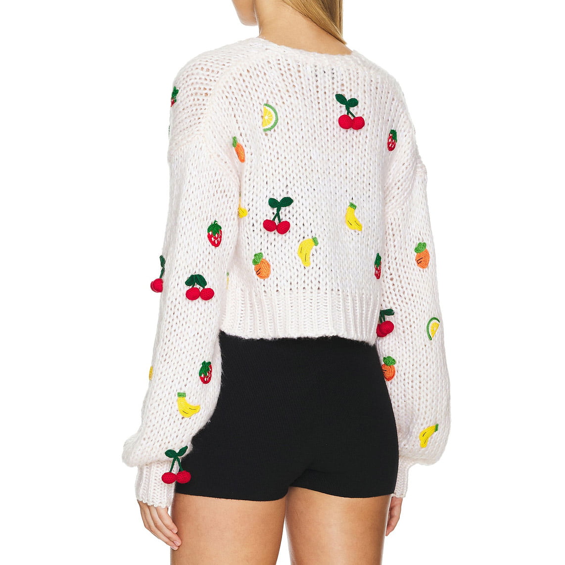 Colorful embroidered fruit motifs add a lively, playful touch to your cardigan.